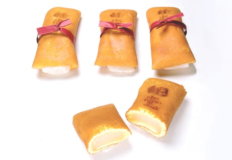 表面の皮はカステラ風生地(中華生地)で、中には柔らかく練り上げたお餅(求肥)を包みました。