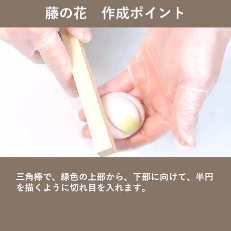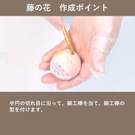 藤の花:紫色の練り切りを薄ピンク色の練り切りで包餡(包み込み)し、細工棒で藤の花を形取る事で、ほんのり下地の紫色が浮き出せます。