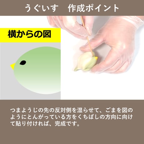 うぐいす:布巾を利用して、羽を表現します。ごまを目に見立てれば完成です。布巾でうぐいすの整形が重要となります。