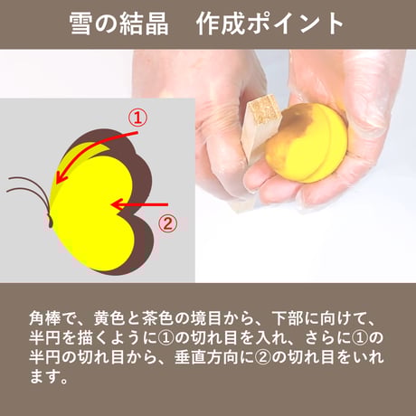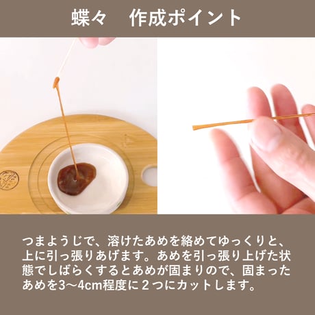 蝶々:角棒と細工棒で蝶々の羽を形取り、熱してやわらかくした黒飴で触角を作成します。
