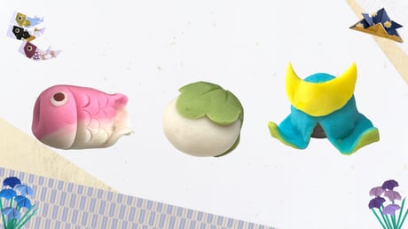 歳時記シリーズ「端午の節句」では、こどもの日にちなんだ鯉のぼり・かぶと・柏餅を、練り切りで表現しました。
