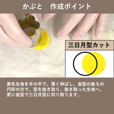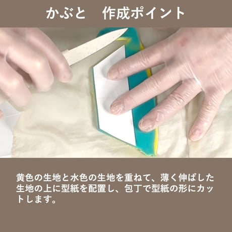 水色と黄色の練り切り生地を重ねて薄く伸ばし、型紙を使って兜型にカットします。