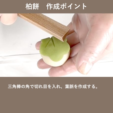 和菓子作りの基本形である白色の練り切りでこしあんを包餡(包み込み)し、緑色の練り切りを薄く伸ばし、型で抜き、葉っぱの形を表現し、三角棒で葉脈を加えます。